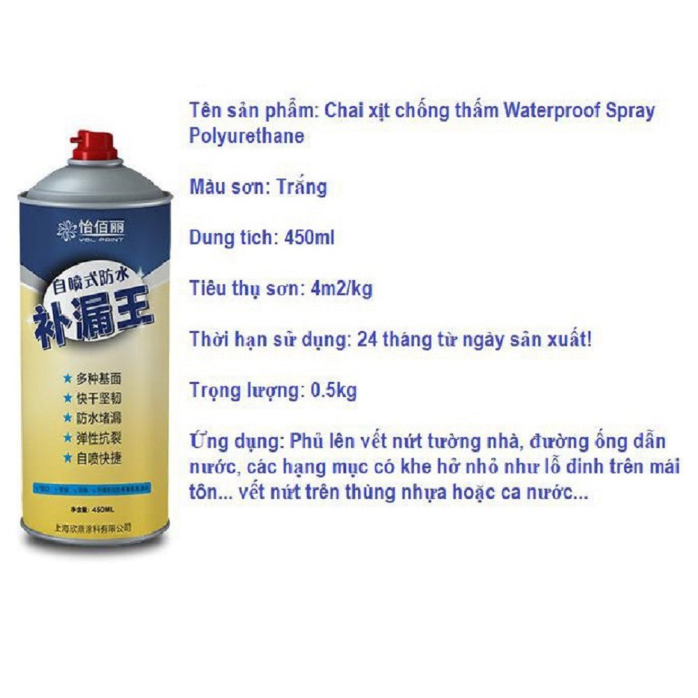 Bình xịt chống thấm nước giúp bịt kín mọi khe nứt một cách nhanh chóng.Bình xịt chống thấm nước phù hợp trên tất cả các chất liệu: Bê tông, gạch men, đá hoa, sắt, tôn, nhựa...