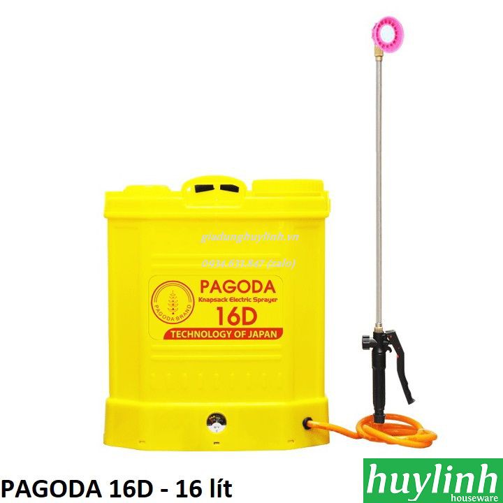 - Bình xịt điện Pagoda 16D là loại máy phun thuốc trừ sâu được sử dụng rộng rãi trong nông nghiệp, y tế... Chiếc bình xịt này giúp người dùng thuận tiện hơn khi phun thuốc cho lúa, hoa màu, phun thuốc khử trùng, thuốc muỗi, phun tưới nước cho cây cảnh...