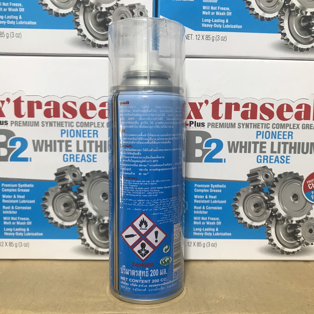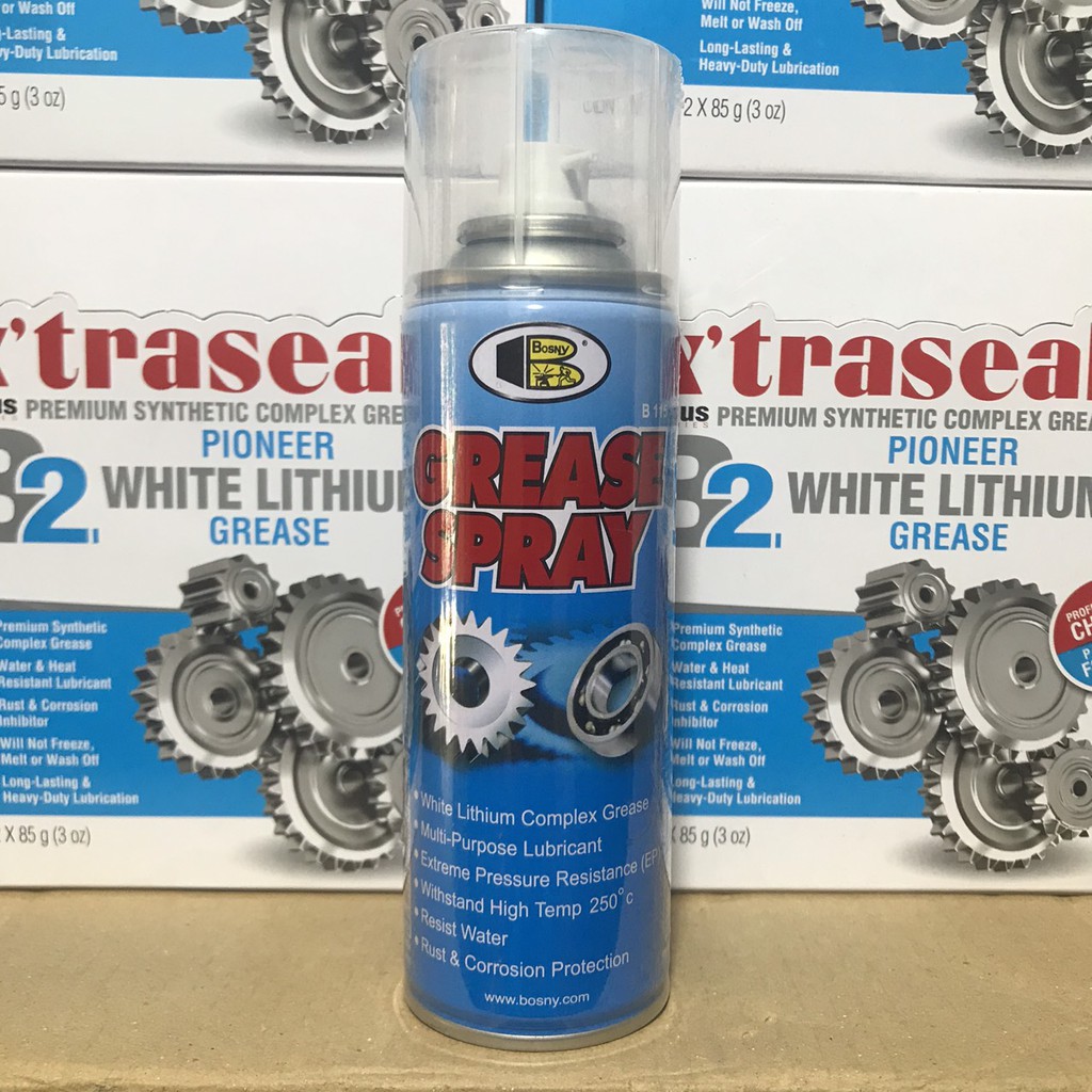 Bình xịt mỡ Lithium Bosy Grease Spray B115 200ml sản xuất tại Thái LanBosny Grease Spray là chất bôi trơn NLGL 3 White Lithium Complex Grease Extreme để sử dụng làm chất bôi trơn đa năng. Nó cung cấp sự bảo vệ lâu dài chống lại mài mòn do ma sát, rỉ sét và ăn mòn. Không chạy hoặc nhỏ giọt. Chịu được nhiệt độ cao lên đến 250 C. Chịu được nước và nhiệt độ cao. Thích hợp cho bản lề cửa, chốt, bánh răng và xích, cáp, ổ trục và máy móc thiết bị bảo vệ và bôi trơn