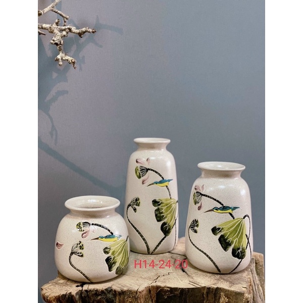 - Bộ 3 bình gốm thiết kế dáng hút Lộc , mang lại nhiều Lộc, nhiều tài cho gia chủ. chính vì vậy được rất nhiều gia đình sử dụng trưng trong phòng khách, bàn làm việc- kích thước : bình cao lần lượt là :24cm/18cm/14cm . miệng rộng 6cm .