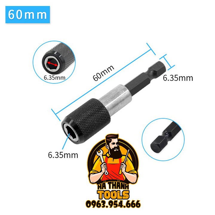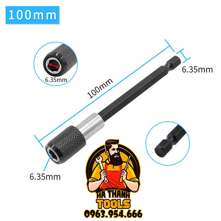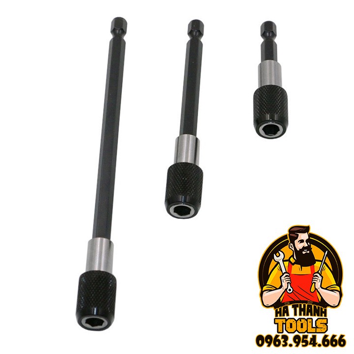 - Bộ 3 đầu kéo dài lục giác thay nhanh cho máy khoan là ba thanh nối dài chuôi lục cho phép kéo dài mũi khoan, mũi bắt vít thêm 60mm, 100mm, 150mm để khoan hay vắt vít các vị trí xa khó thao tác hay không gian hẹp. Các đầu nối dài này đều có nam châm để hút mũi vít, mũi khoan chuôi lục. Khi nối tất cả các thanh với nhau sẽ dài đến 300mm - CÓ THỂ NỐI CẢ 3 ĐẦU VỚI NHAU- Đầu nối dài lục giác thay nhanh hay còn gọi là thanh kéo dài lục giác thay nhanh , đúng như tên gọi của nó là một thanh nối cho phép kéo dài các đầu gắn vào máy khoan máy bắt vít như mũi vít, mũi khoan, ...