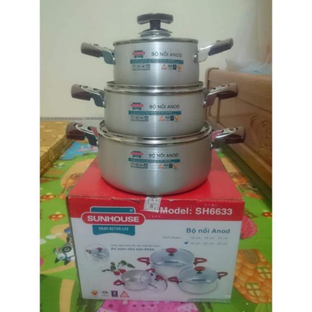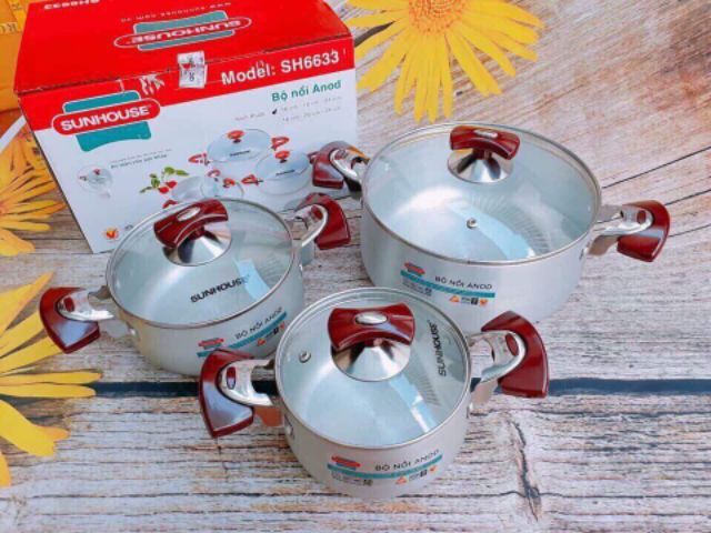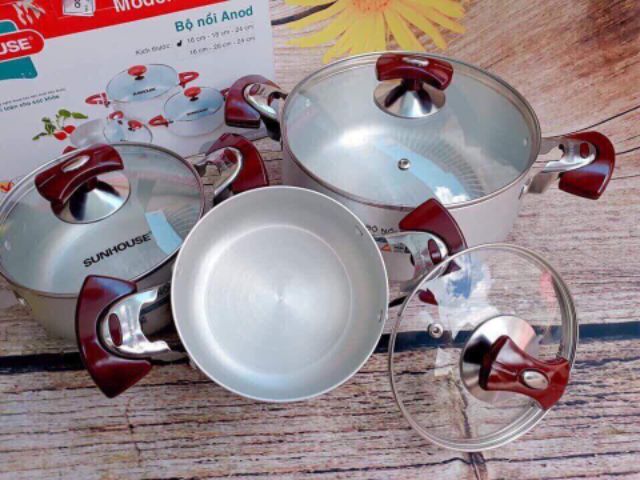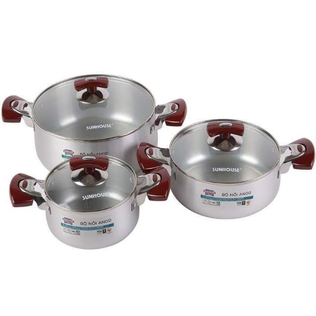 BỘ NỒI ANOD SUNHOUSEVới 3 kích thước khác nhau: 16, 20, 24cm phù hợp cho gia đình tùy món ăn nè.