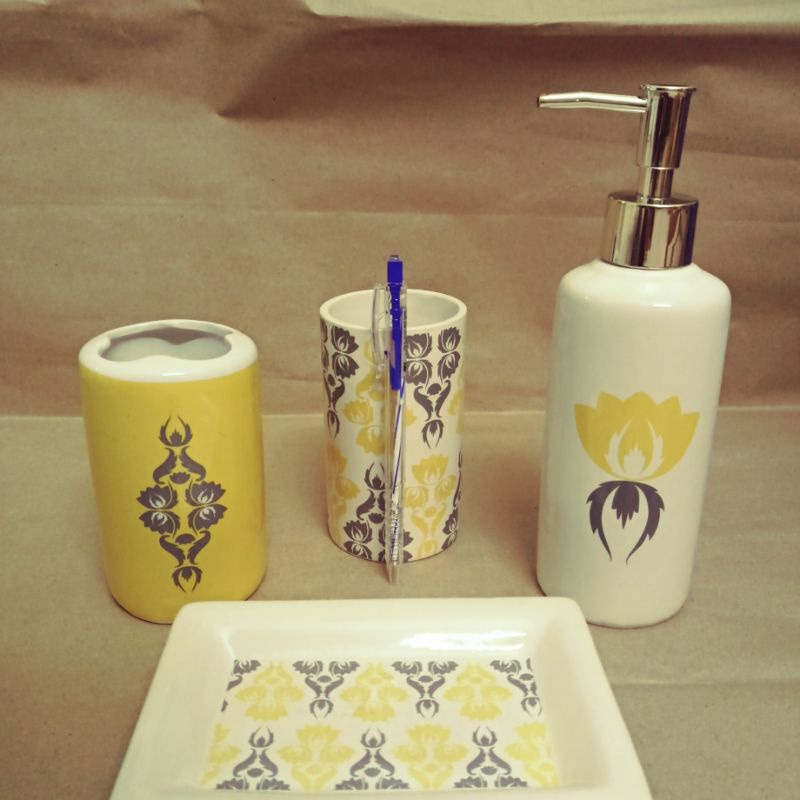 Bộ 4 món đồ dùng cho nhà tắm gồm 1 khay đựng xà bông, 1 cốc đựng bàn chải, 1 cốc nước, 1 lọ đựng nước rửa tay.Chất liệu: sứ.