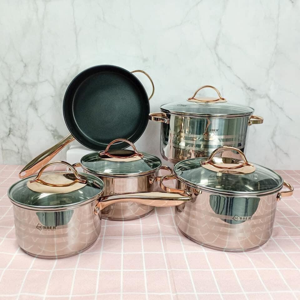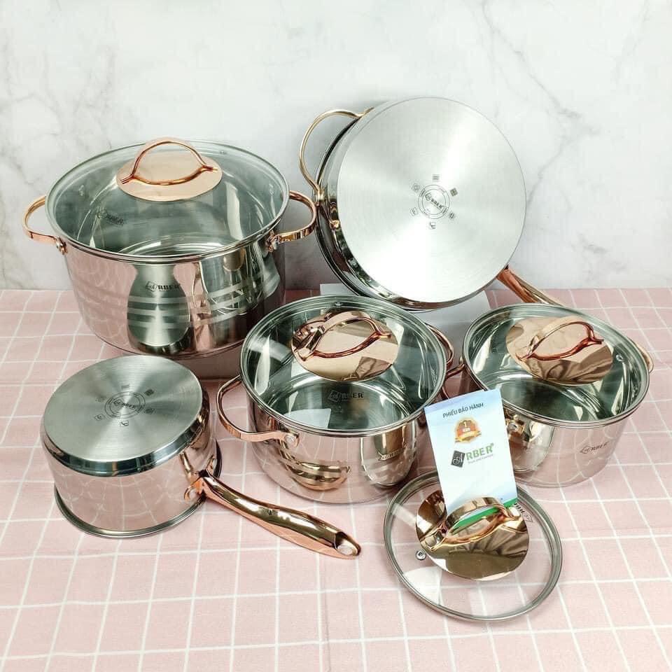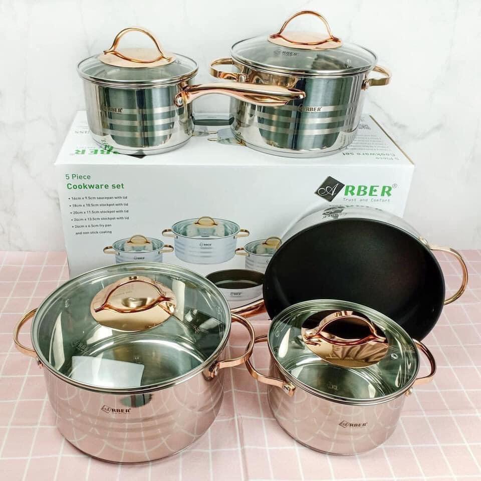 ☘️☘️BỘ 5 MÓN ARBER MODEL BRASS AN05BrassBộ nồi từ chảo 5 chiếc cao cấp ARBER làm bằng chất liệu thép không gỉ, đáy bộ nồi 3 đáy siêu bền khi sử dụng, bộ nồi tiếp xúc nhiệt nhanh, êm, tản nhiệt đều khi nấu. Bộ nồi từ 5 chiếc cao cấp ARBER