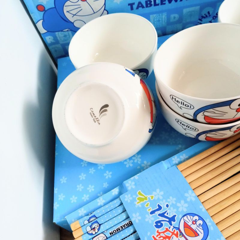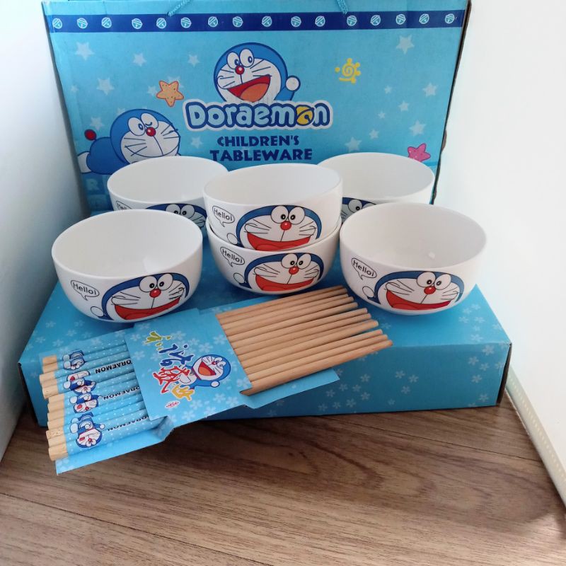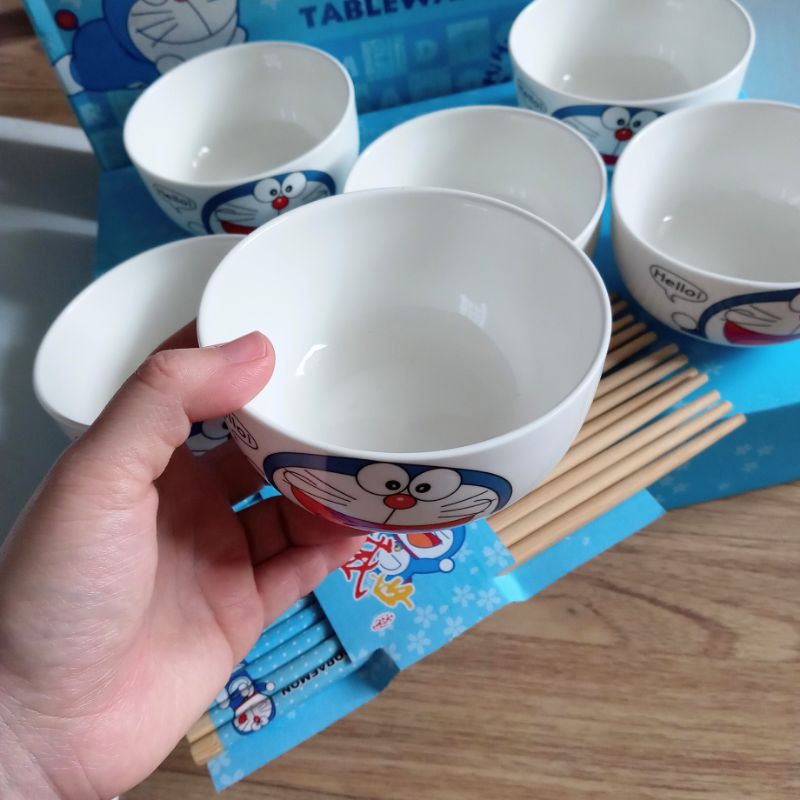 Bộ 6 bát sứ kèm 6 đôi đũa gỗ tre hình Doraemon đáng yêu.Kích thước: 1 bát 10x6cm, đũa dài 22cm.