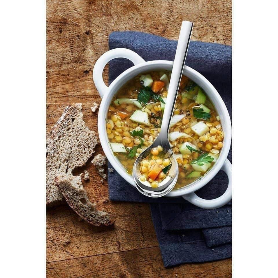 🍀 Bộ sản phẩm thìa ăn súp WMF Nuova gồm 6 thìa được làm từ chất liệu thép không gỉ Cromargan 18/10 dày dặn, đánh bóng sáng đẹp. Thìa có phần đầu múc lớn tương đường thìa ăn (nhỏ hơn thìa ăn 1 chút xíu). Thìa thích hợp sử dụng làm thìa ăn súp, thìa ăn cơm, có thể ăn bún miến phở... Chiều dài thìa 17cm