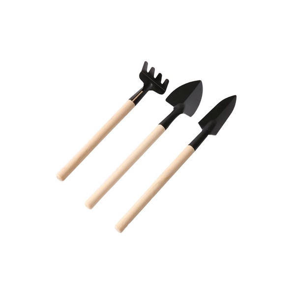 Sản phẩm là bộ ba làm vườn mini gồm: 1 dụng cụ xẻng, 1 dụng cụ xúc và 1 dụng cụ cào.Bộ ba dụng cụ có thân làm bằng gỗ nhẹ và phần dụng cụ kim loại.