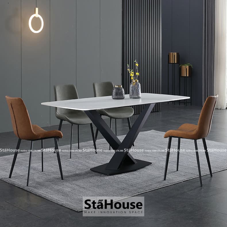 Bàn: Bàn ăn mặt đá Ceramic theo công nghệ Châu Âu, chống trầy xước, ố màu. Chân kim loại sơn tĩnh điện đen