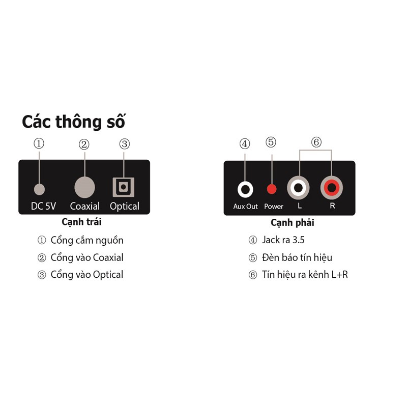 Chuyển đổi tín hiệu âm thanh từ Digital (Optical, Coxial) sang Analog với đường âm thanh (L/R) hoặc cổng 3.5