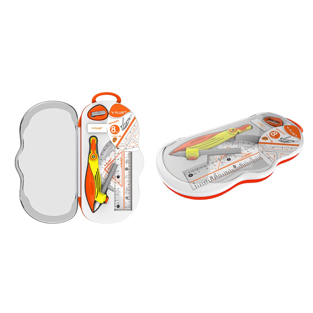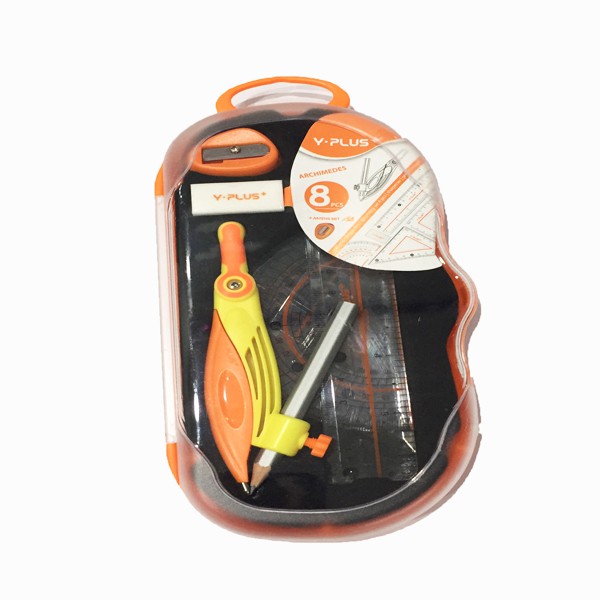 - Bao gồm: 1 compas,1 bút chì gỗ nhỏ gắn vào compas, 1 gôm, 1 chuốt, 1 thước dài 15 cm, thước eke, thước đo độ.