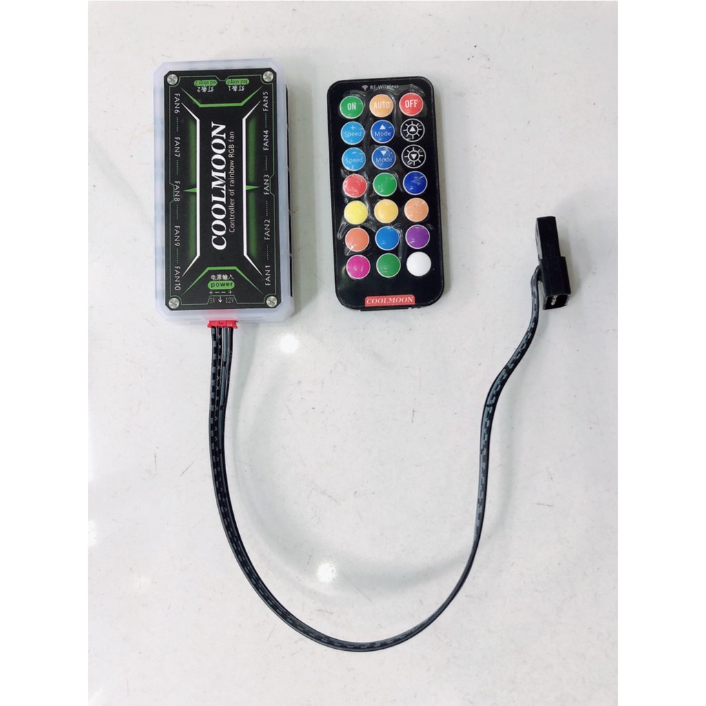 Mô tả sản phẩm:- Remote điều khiển từ xa và Hub tương thích dùng chung cho cả Fan Coolman và Coolmoon, dùng sóng RF cho khả năng phát và nhận tín hiệu với khoảng cách xa và xuyên vật cản tốt. - Lắp quạt vào bộ Hub theo thứ tự liên tục từ Fan1 -> Fan10. - Kết nối dây nguồn vào Hub điều khiển với bộ nguồn của máy tính theo dạng Molex 4pin. - Bật remote và điều khiển các hiệu ứng và tốc độ theo ý muốn. - Hub controller mới có thêm các tính năng sau : hiệu ứng LED mới, điều tốc fan (từ 0 -1800rpm) , chỉnh tốc độ hiệu ứng LED tùy ý (nhanh /chậm), chỉnh độ sáng/tối của LED tùy ý.