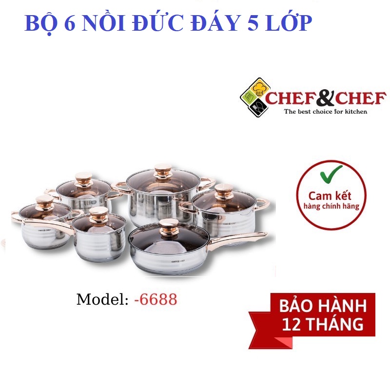 BỘ NỒI CHẢO ĐÁY TỪ 5 LỚP 6 MÓN VUNG KÍNH CHEF&CHEF 12 CHI TIẾTSet 6 món -12 chi tiết bao gồm :