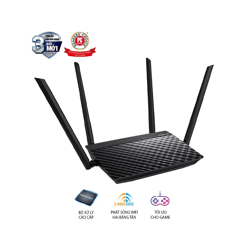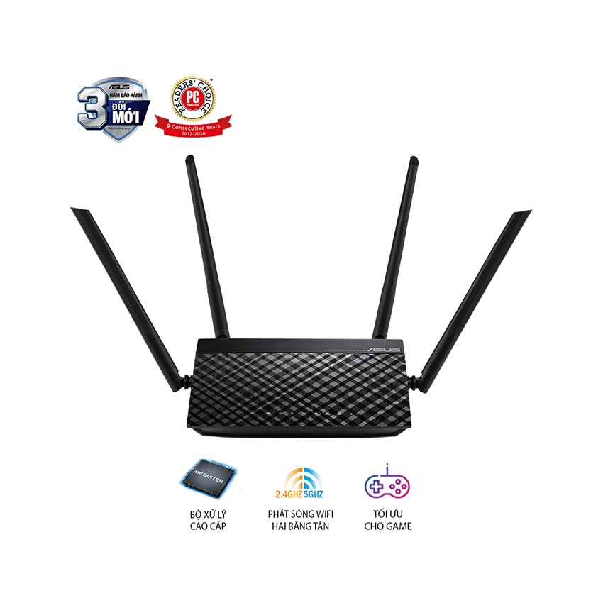Thông lượng đồng thời 300 Mbps (2.4GHz) và 433 Mbps (5GHz) cho hiệu suất mạng không dây tốc độ cao.Giao diện bảng điều khiển ASUSWRT giúp bạn dễ dàng thiết lập và quản lý bộ định tuyến.