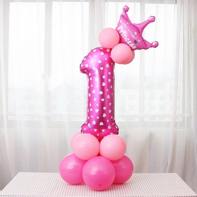 Số 1 cao 60cm, có 2 màu xanh bi và hồng bi, trang trí dạng cột bóng đứng trước cổng hoặc ngay bàn galary rất đẹp nha!!!!!!!!! Khách thích gắn thêm vương miện v bóng như hình thì mua riêng nhacombo bóng gồm: 12 bóng cao su, 1 bóng số 1 size đại, 1 hình vương miện