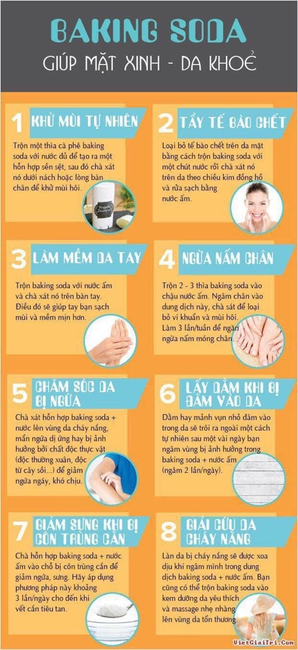 Da bị cháy nắng: 1/2 chén banking soda vào bồn tắm, ngâm mình tắm thỏa thích, sau đó lau sạch. 3-5 ngày da đỏ ửng dịu lại 1 cách thần kỳ