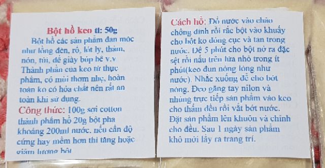 Công thức hồ: 100g cotton sản phẩm cần 20g bột hòa tan với khoảng 200ml nước. Tăng hoặc giảm lượng bột nếu muốn sản phẩm cứng hoặc mềm hơn.