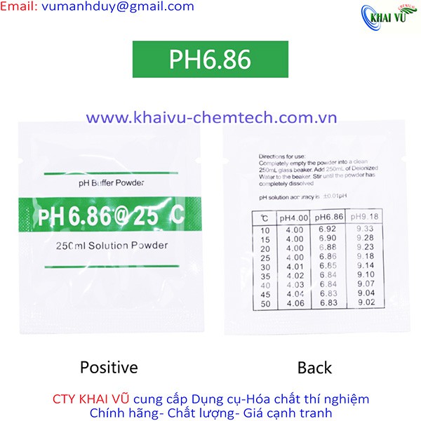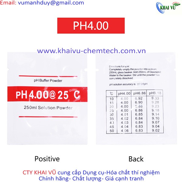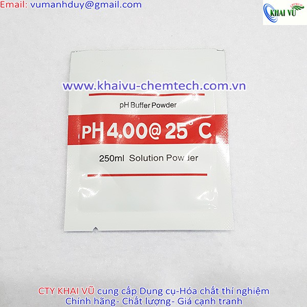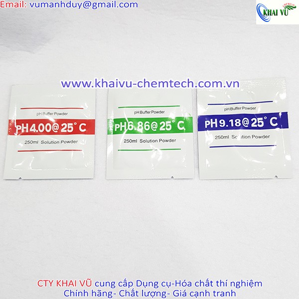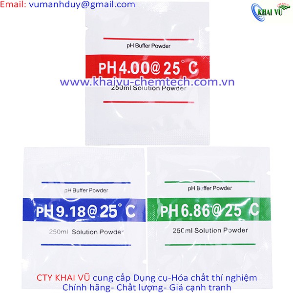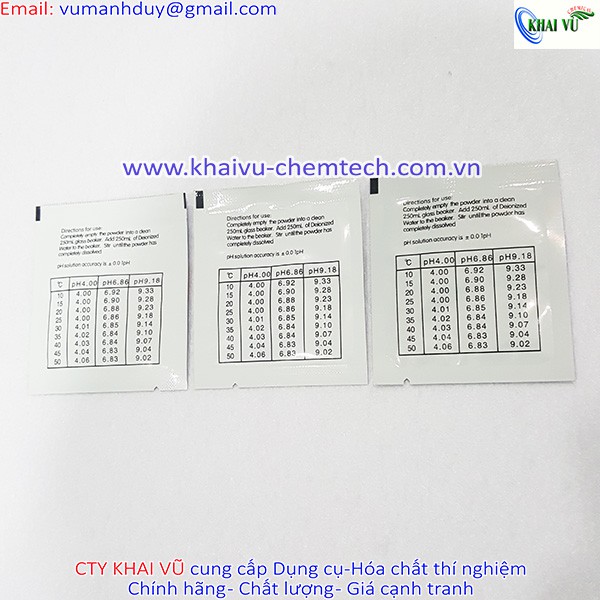 Công ty KHAI VŨ chuyên cung cấp Bột pha dung dịch chuẩn pH gồm 3 gói 4.00 (Hay 4.01) + 6.86 + 9.18 dùng cho bút đo pH
