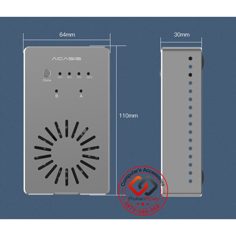 Box thiết kế nút nhân bản riêng, và đèn LED hiển thị % từ 25% 50% 75% và 100% đây là tiến trình, tốc độ sao chép.