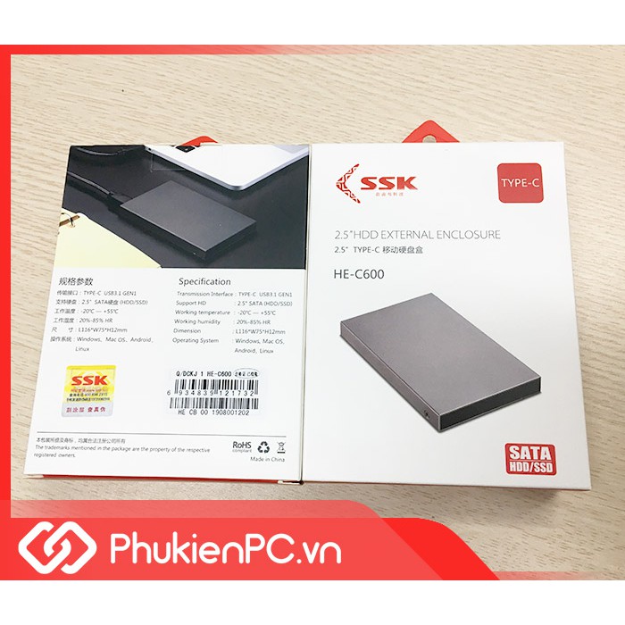 Box đựng ổ cứng HDD SSD SATA 2.5 inch (ổ cứng laptop) chân cắm USB Type C thương hiệu SSK chính hãng. Biến ổ cứng HDD, SSD thành ổ cứng di động cắm ngoài USB. Nhiều bạn sau khi nâng cấp ổ cứng SSD cho laptop thường dư ra ổ cứng HDD, đây là cách nhanh nhất bạn có box ổ cứng cắm ngoài USB sao chép dữ liệu.Box SSD SATA 2.5 SSK có kích thước nhỏ gọn, vỏ ngoài bằng nhôm tác dụng tản nhiệt tốt cho ổ cứng bên trong. Tăng tính thẩm mỹ, sang trọng. Sản phẩm lý tưởng cho bạn có ổ cứng cắm ngoài hình thức đẹp, tốc độ cao. Sử dụng cho laptop, macbook, surface pro, pc, máy tính đồng bộ.