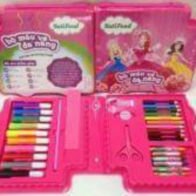 Về 300 bô màu nutiBộ gồm: 10 bút chì màu + 6 bút sáp màu + 10 bút lông + 1 kéo + 1 thước + 1 chuốt bút chì + 1 viết chì + 1 gôm. Kích thước 23 x 21,5cm.