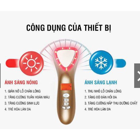 – Chức năng của siêu âm nóng : Búa Massage Nóng Lạnh Kết Hợp Ánh Sáng Sinh Học Tạo bước sóng siêu âm nhiệt độ lên 42 độ C (nở nang lông, tăng tuần hoàn máu, loại bỏ độc tố, giảm nếp nhăn )