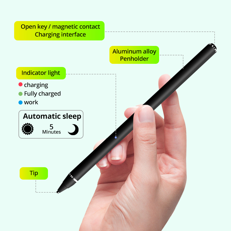 1. Tương thích với bút điện dung hoạt động, tương thích với hệ thống Apple + Android, giao diện sạc Android, một đầu bút dẫn điện không thể thay thế, nắp bút từ tính, không có chức năng chống cảm ứng.