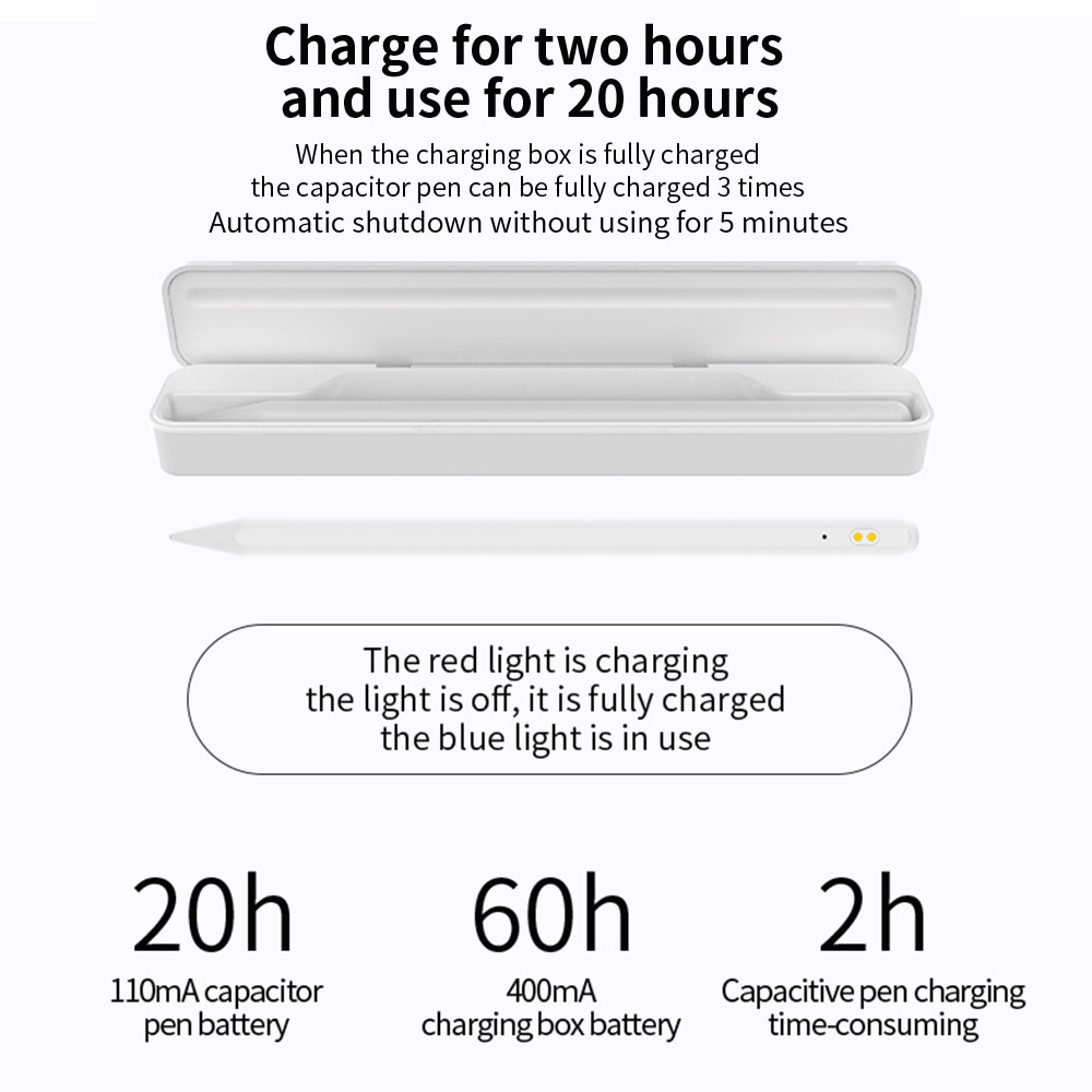 Chỉ cần nhấn đúp vào nút nắp liên tục, bút sẽ bật hoặc tắt. Tự động tắt và bật " Chế độ Ngủ " sau khi không hoạt động trong vòng 5-10 phút để tiết kiệm điện. Sạc từ tính nhanh chóng và tiện lợi. Làm việc liên tục 20 giờ, sạc 90 phút, thời gian chờ 90 ngày.