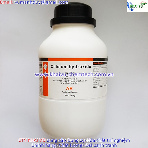 Calcium hydroxide Xylong CAS 1305-62-0 Ca(OH)2 lọ 500g canxi hidroxittảCanxi hydroxit là một hợp chất hóa học với công thức hóa học Ca(OH)₂. Nó là một chất dạng tinh thể không màu hay bột màu trắng, và thu được khi cho Canxi ôxít tác dụng với nước. Nó cũng có thể kết tủa xuống khi trộn dung dịch chứa Canxi clorua với dung dịch chứa Natri hiđroxit.