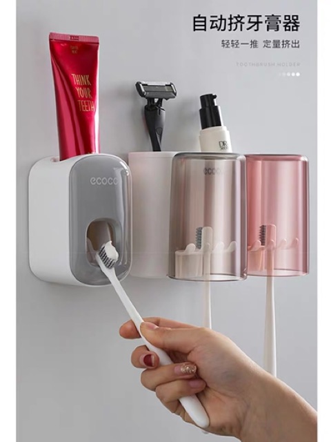 GIỚI THIỆU SP : kệ đựng 2 cốc 3 cốc và 1 nhả kem đánh răng ECOCO Cao cấpSản phẩm gồm dụng cụ nặn kem đánh răng tự động bên phải của ảnh. Chất liệu PVC bền, đẹp thân thiện với môi trường, an toàn với sức khỏe. - Dễ dàng thay đổi vị trí - Giữ cho bàn chải, cốc, kem đánh răng, sạch sẽ Phần để tuýp kem đánh răng là dạng nặn kem tự động, chỉ cần đưa đầu bàn chải vào nhấn nhấn là kem đánh răng chảy xuống, rất tiện Sử dụng công nghệ hút chân không hiện đại hút siêu dính, không cần khoan vít.
