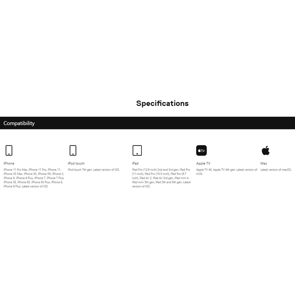 - Kết nối không dây chính thức được Apple cấp phép cho tất cả các sản phẩm của Apple bao gồm các thiết bị iOS, iPadOS và tvOS.