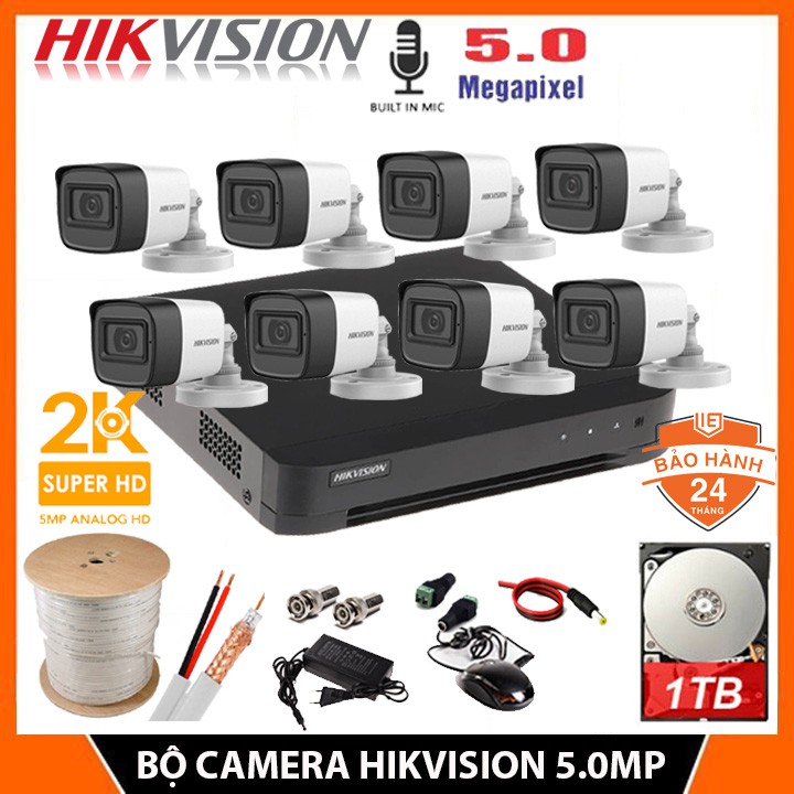 Bộ camera giám sát 8 mắt HIKVISION 5.0MP [2K] Chính hãng, Kèm HDD 1TB + Đủ phụ kiện để lắp đặt - BH 24 Tháng