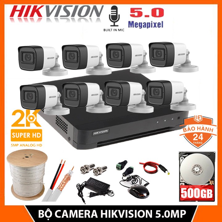 Bộ camera giám sát 8 mắt HIKVISION 5.0MP [2K] Chính hãng, Kèm HDD 500GB + Đủ phụ kiện để lắp đặt - BH 24 Tháng