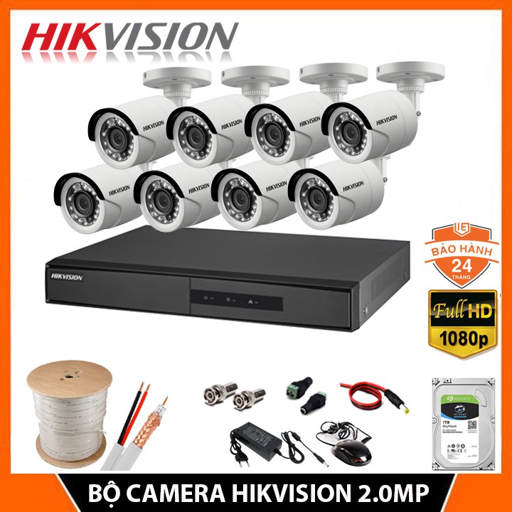 Bộ Camera giám sát Hikvision 2.0MP - FUll hd 1080p, Trọn bộ 5/6/7/8 Camera đầy đủ phụ kiện lắp đặt + ổ cứng lưu trữ HDD