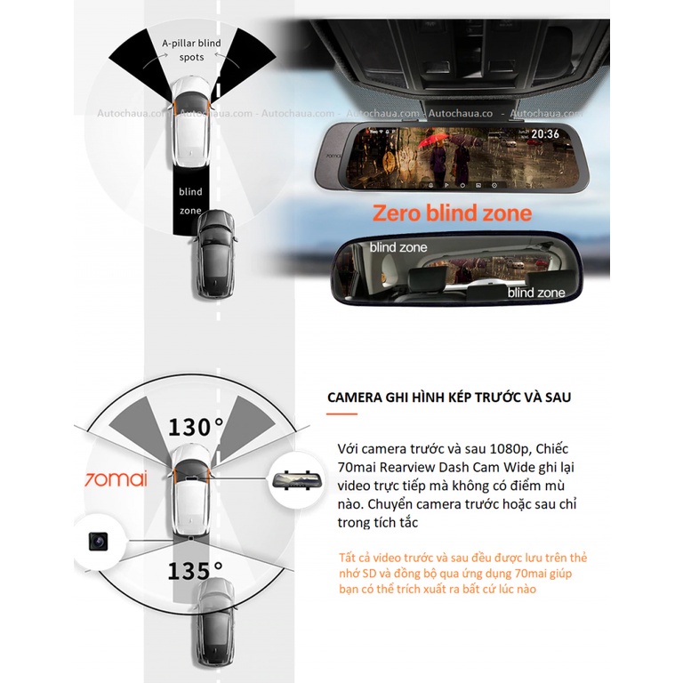 Góc quay cam trước Camera gương 70mai: 130º