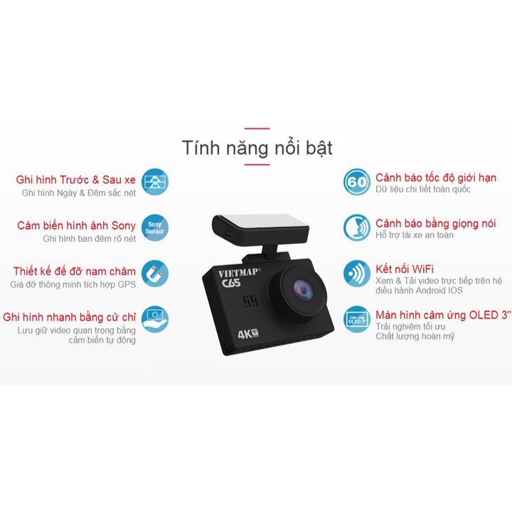 VietMap C65 được đồ vật camera trước độ phân giải Ultra HD 4K hài hòa cùng camera sau Full HD 1080p đồ vật cảm biến ảnh Sony Starvis, ghi lại chi tiết tất cả hành trình trước sau xe cộng có tốc độ.
