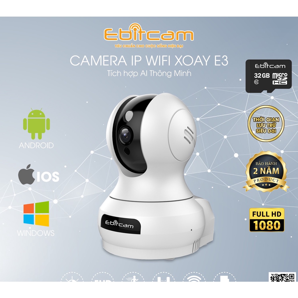 Camera IP Wifi EbitCam E3 2MP Full HD 1080P, đàm thoại 2 chiều, quay 355 độ, hỗ trợ thẻ nhớ lên 256G, hàng chính hãng