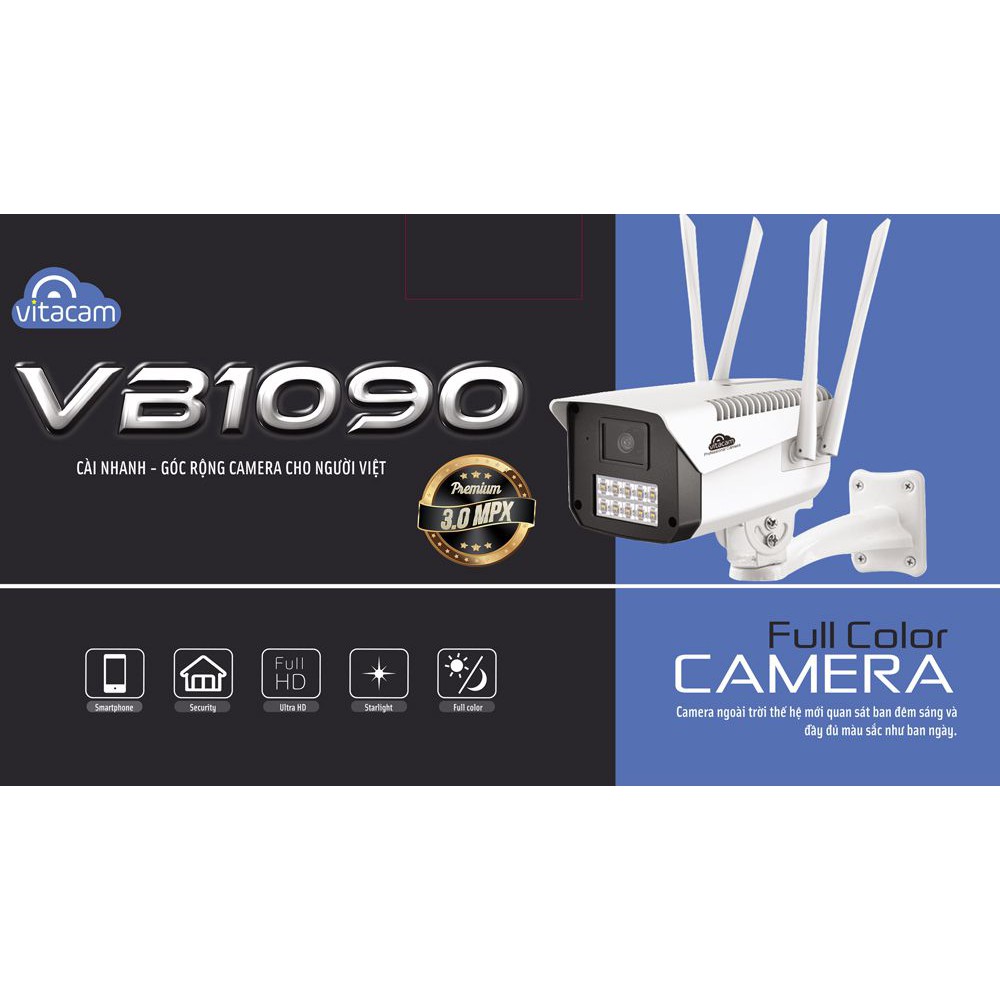Camera Vitacam VB1090 quan sát ban đêm đầy màu sắc hệ thống 10 đèn led độ sáng cao, công suất cao được trang bị độ phân giải 3.0 MPX Ultra HD 1080P mang đến chất lượng hình ảnh, video ro ràng sắc nét