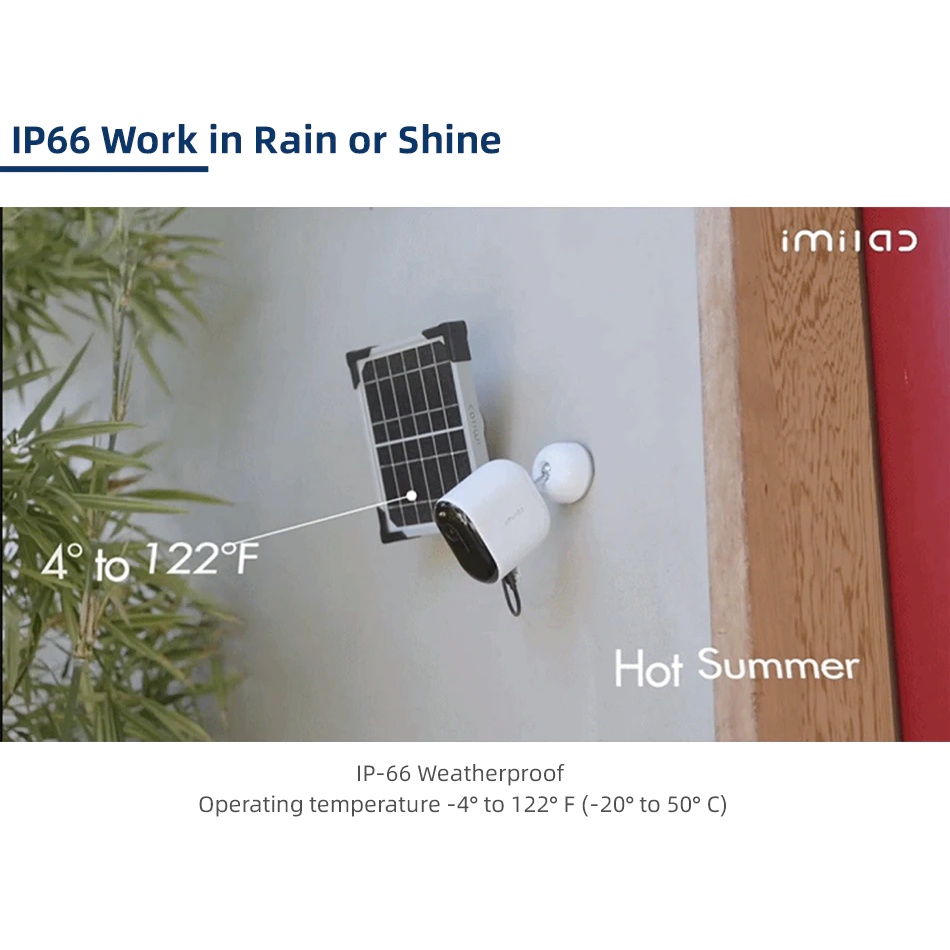 👉Ngoài việc sử dụng pin là nguồn năng lượng chính thì Camera Imilab EC4 còn có khả năng hoạt động bằng năng lượng mặt trời (mua rời không đi kèm với bộ sản phẩm) , người dùng có thể trang bị thêm mà không phải sử dụng đến nguồn điện trực tiếp. Tích hợp chuẩn chống nước IP66, đảm bảo tính ổn định và độ bền ở mọi điều kiện thời tiết.