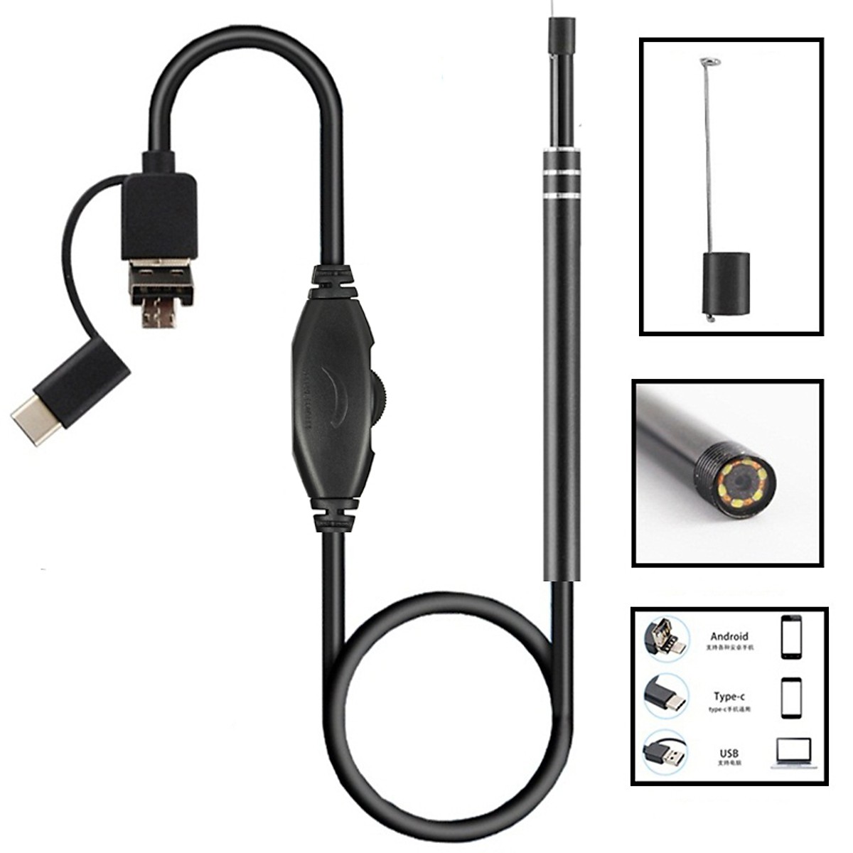 - Đầu camera nội soi có kích thước 5.5mm có thể len lỏi những nơi tiết diện nhỏ, trang bị 6 bóng Led có thể điều chỉnh độ sáng giúp dễ dàng nội soi lấy ráy tai 3 đầu cắm trong 1: đầu USB, micro USB và Type C