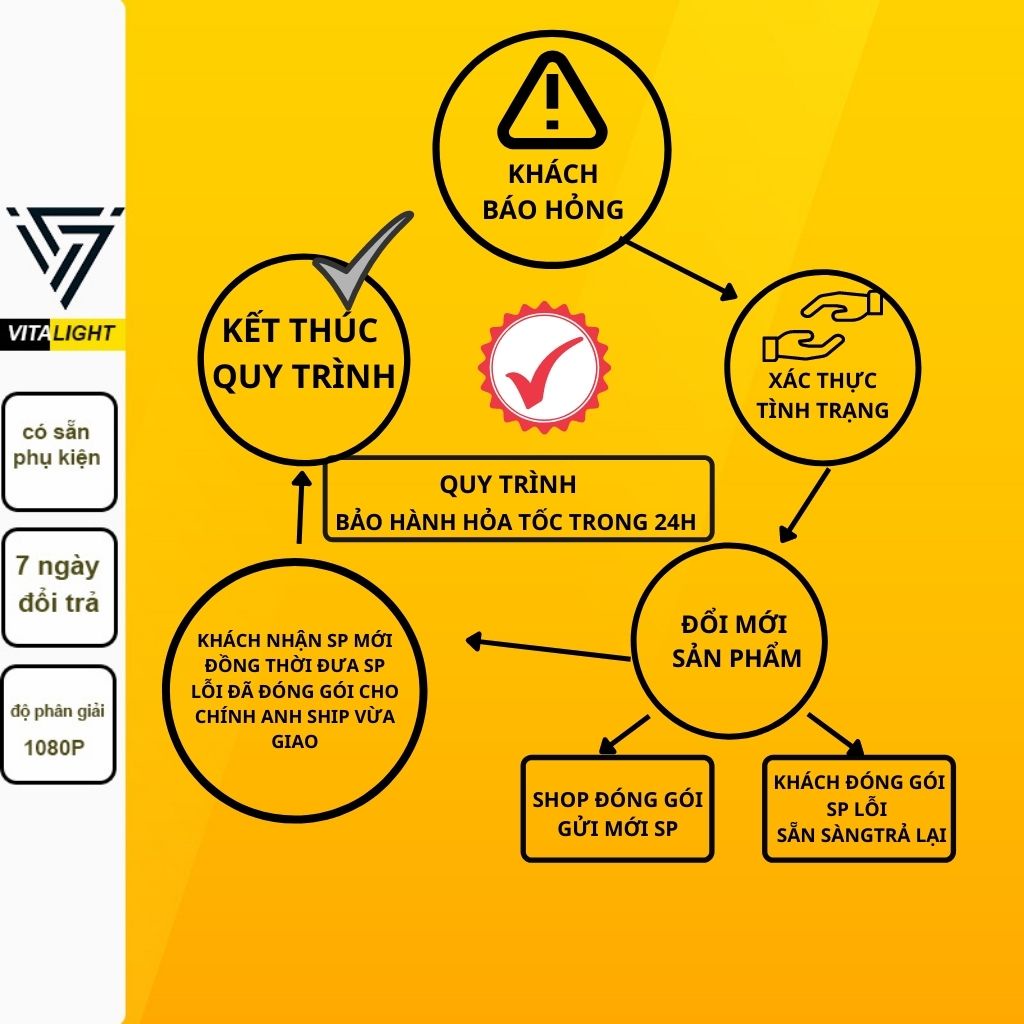 Khách hang báo hỏng > Vitalight xác nhận hỏng > Vitalight gửi ngay sản phẩm mới> khách hàng đóng gói sp lỗi > shiper giao đồ mới > khách nhận đồ mới, giao lại đồ hỏng. Tất cả cam kết hỏa tốc và miễn phí ship bảo hành