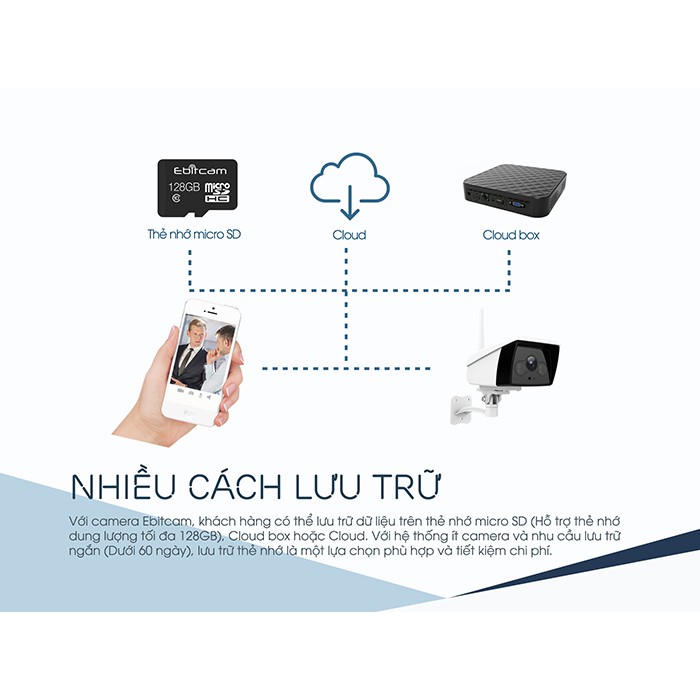 - Với camera Ebitcam, khách hàng có thể lưu trữ dữ liệu trên thẻ nhớ micro SD (Hỗ trợ thẻ nhớ dung lượng tối đa 128GB), Cloud box hoặc Cloud. Với hệ thống ít camera và nhu cầu lưu trữ ngắn (Dưới 60 ngày), lưu trữ thẻ nhớ là một lựa chọn phù hợp và tiết kiệm chi phí