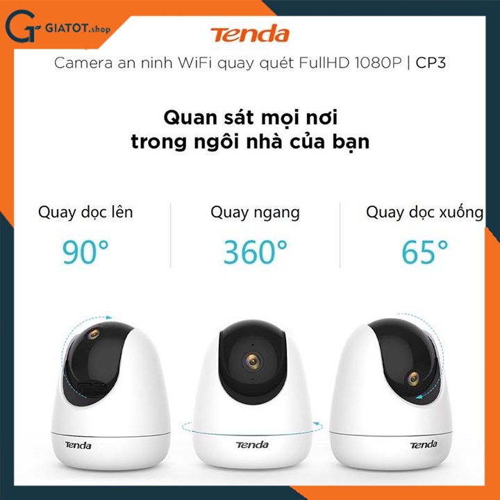 => Quan sát mọi nơi trong ngôi nhà của bạn Nhờ động cơ mạnh mẽ mang lại khả năng quay quét tốc độ cao, Tenda CP3 có thể quay ngang 360° và dọc 155° (90° trên, 65° dưới) mang lại tầm nhìn toàn cảnh không góc chết.