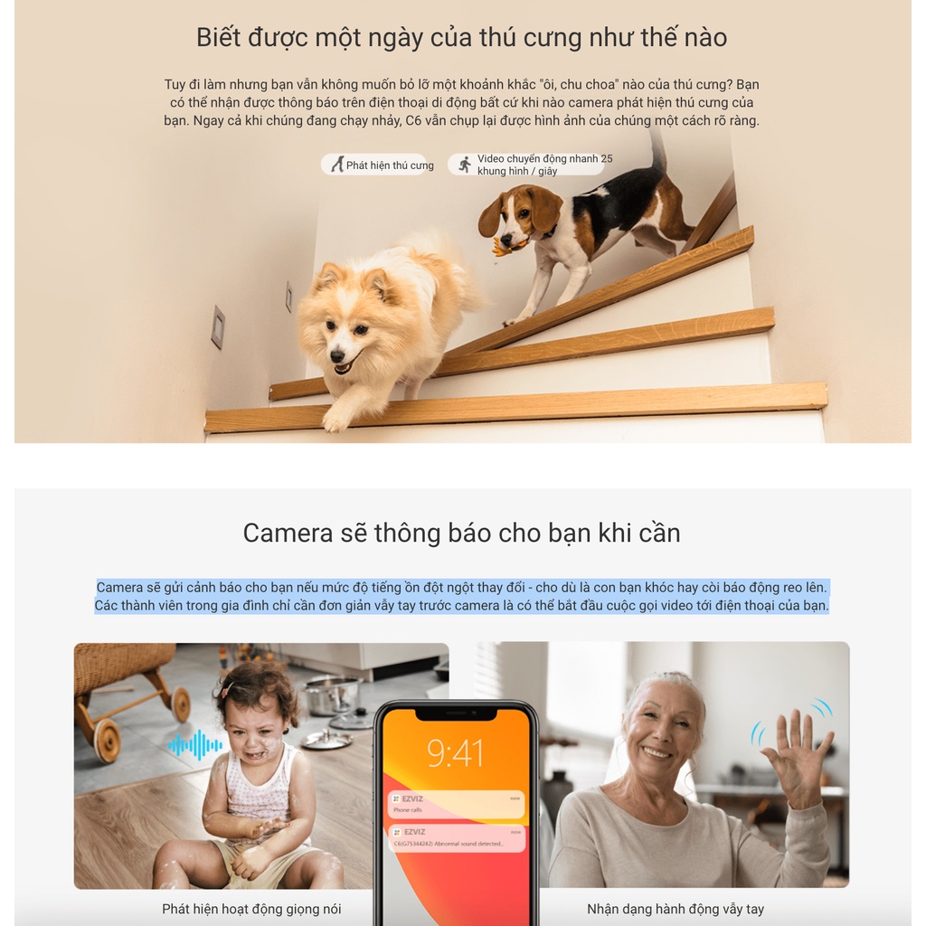 Tuy đi làm nhưng bạn vẫn có thể theo dõi thú cưng của bạn ở nhà có ổn không? Bạn có thể nhận được thông báo trên điện thoại di động bất cứ khi nào camera phát hiện thú cưng của bạn. Ngay cả khi chúng đang chạy nhảy, C6 vẫn chụp lại được hình ảnh của chúng một cách rõ ràng.