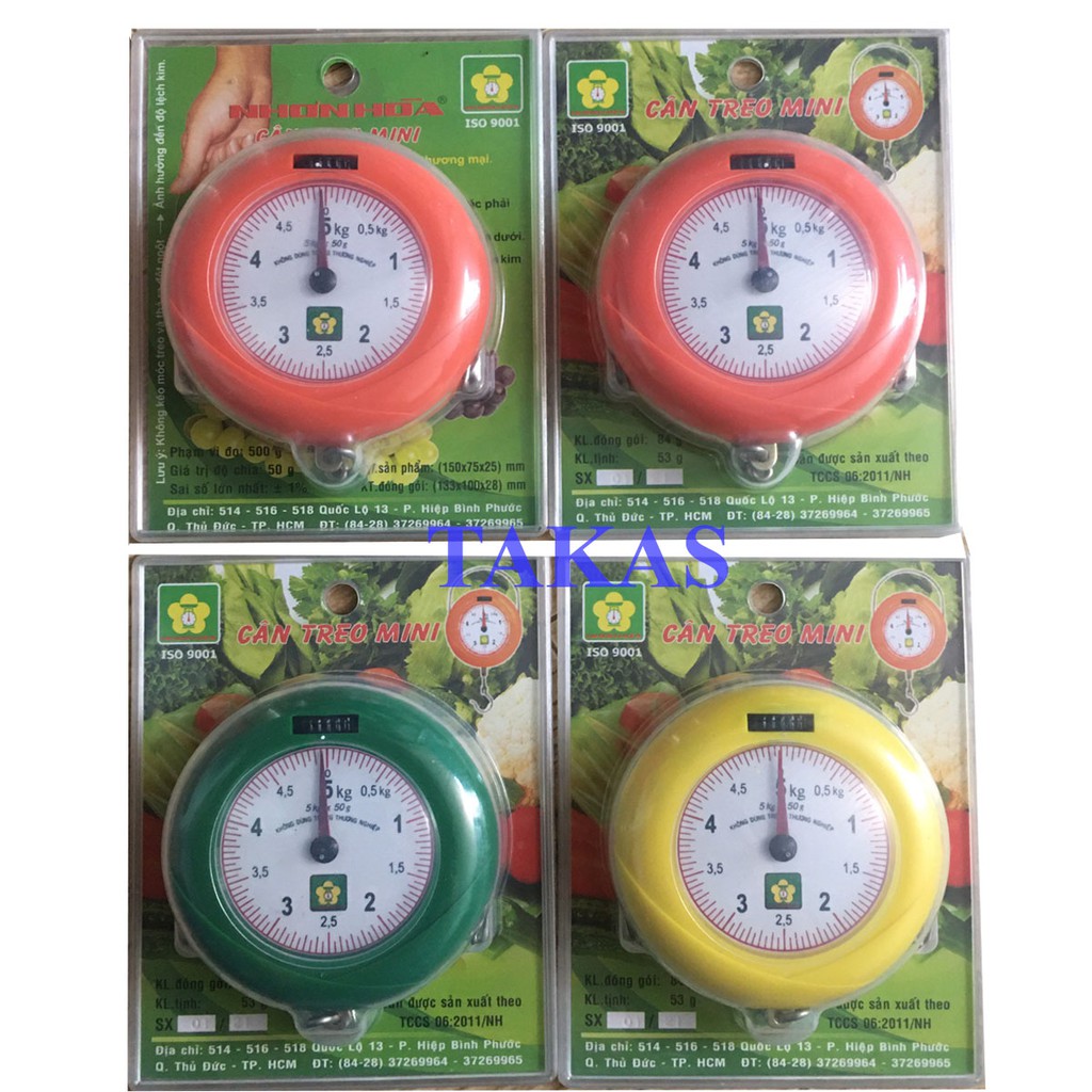 Cân treo mini 5kg Nhơn Hòa NHMGS-5 có kiểu dáng sang trọng; mặt đồng hồ chia rõ nét dễ quan sát khi đọc số cân, cân có phạm vi cân lớn từ 5g tới 5kg. Khi làm việc ở môi trường ngoài trời, bạn có thể an tâm vì màu sắc số cân và kim chỉ thị luôn ổn định, không thay đổi nên rất thuận tiện khi sử dụng.- Ưu điểm của cân treo mini Nhơn Hòa NHMGS-5 5kg: có thiết kế theo tiêu chuẩn và được kiểm định chất lượng số TCCS 06:2009/NH, thiết kế rất tiện dụng có thể treo lên cân, hoặc móc vào tay cân; ngoài ra, với thiết kế nhỏ gọn bạn có thể bỏ túi mang đi mọi nơi dễ dàng… Bên cạnh đó, sự đa dạng về màu sắc của cân: các màu đỏ, cam, vàng, xanh phù hợp với từng nhu cầu và sở thích cũng như cá tính của người sử dụng, chắc chắn sẽ làm bạn hài lòng.
