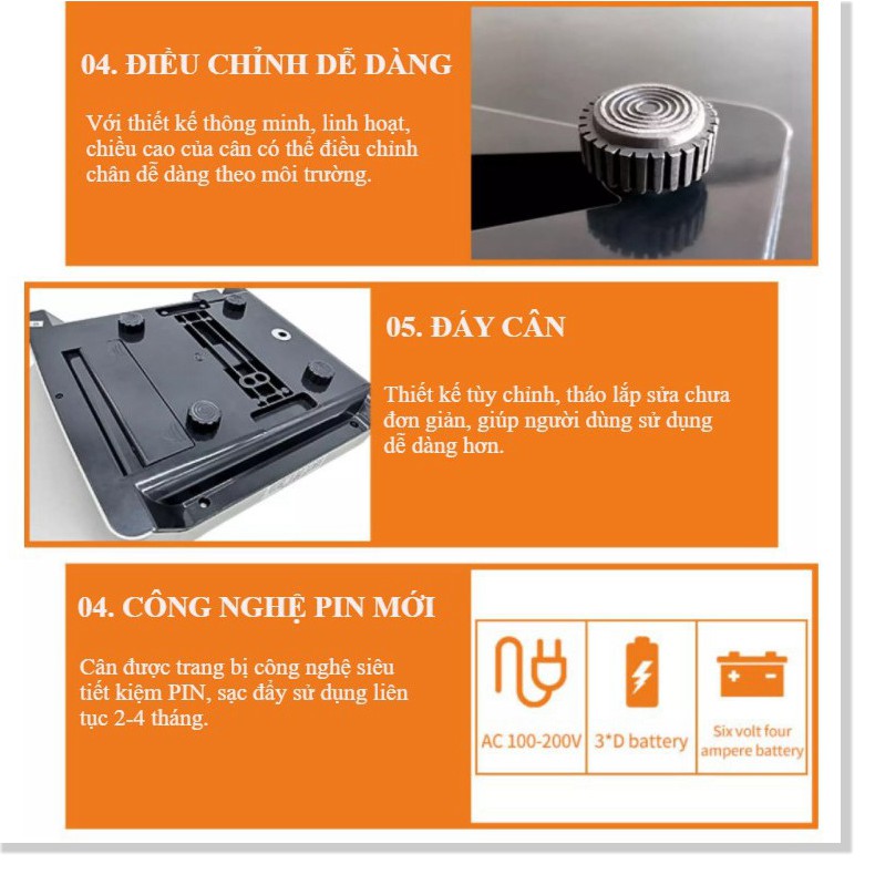 – Cân tự động chuyển sang chế độ tiết kiệm pin sau 10s không sử dụng. Giúp giảm thiểu số lần sạc điện cho cân