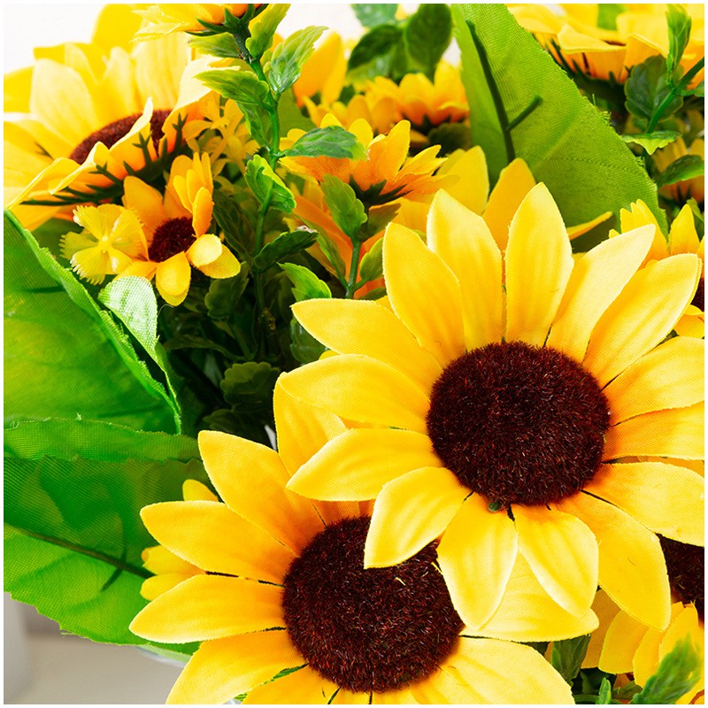 -13 bông hoa hướng dươngQuy cách : chiều cao tổng thể khoảng 32 cm, 7 nhánh, 4 bông hoa lớn ( đường kính 10cm), 9 bông hoa nhỏ ( đường kính 4cm)