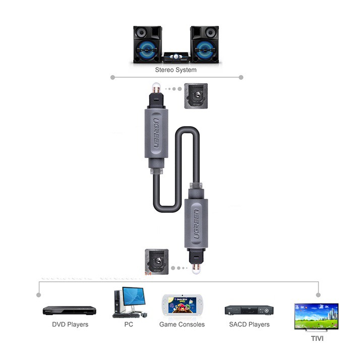 ◇ Cáp Audio quang Optical Toslink dài 1m Ugreen 10768 với âm thanh có thể kết nối các thành phần âm thanh hiệu suất cao, như máy nghe đĩa CD, Blu-Ray, đầu DVD và máy chơi game với một máy thu preamplifier, vi xử lý / âm thanh hoặc chuyển đổi digital-to-analog.