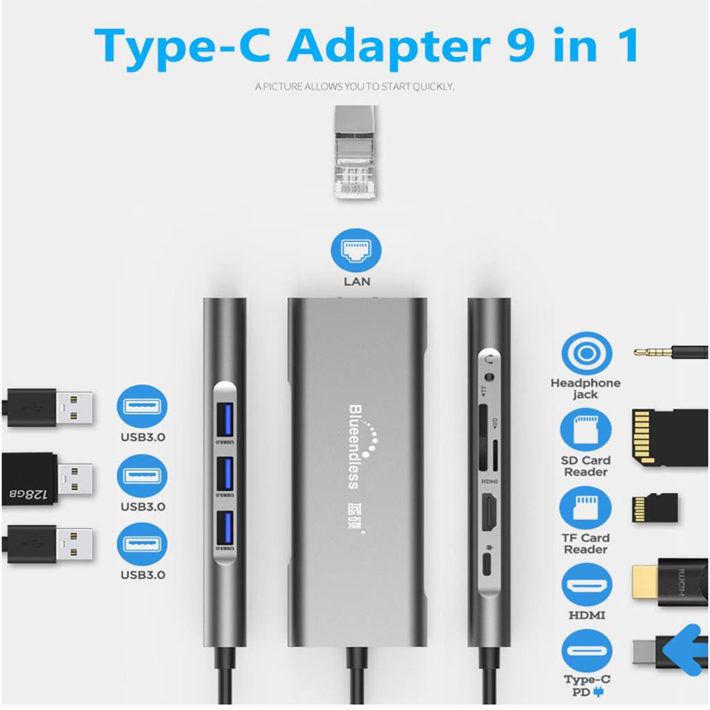 Giới thiệu Cáp Blueendless 5in1, 7in1, 9in1,10in1 Type C Sang HDMI 4K 1000Mbps Ethernet,2 USB 3.0 Ports,SD/TF Card Reader