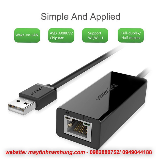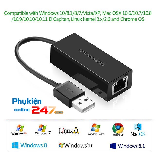 Cáp chuyển đổi cổng USB ra LAN RJ45 Ugreen 20254Cáp USB 2.0 ra LAN RJ45 Network Adapter để kết nối máy tính hoặc máy tính bảng của bạn để một bộ định tuyến, modem hoặc chuyển đổi mạng cho kết nối mạng.
