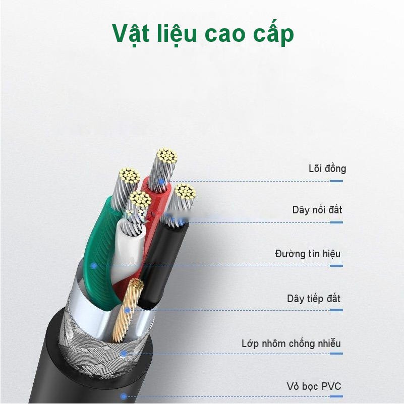 Vật liệu cao cấp với lõi đồng, vỏ bọc PVC và các lớp chống nhiễu đảm bảo tín hiệu truyền ổn định